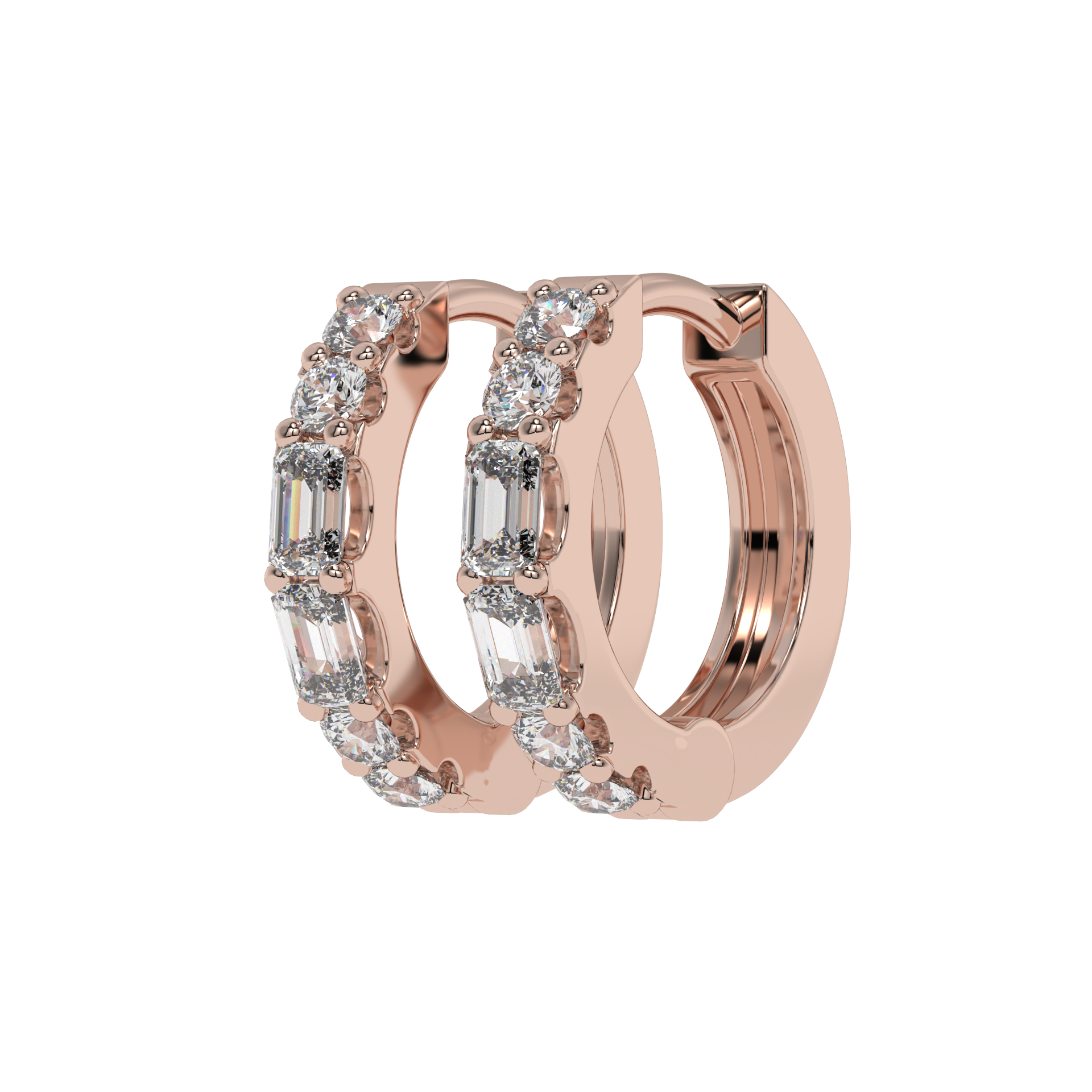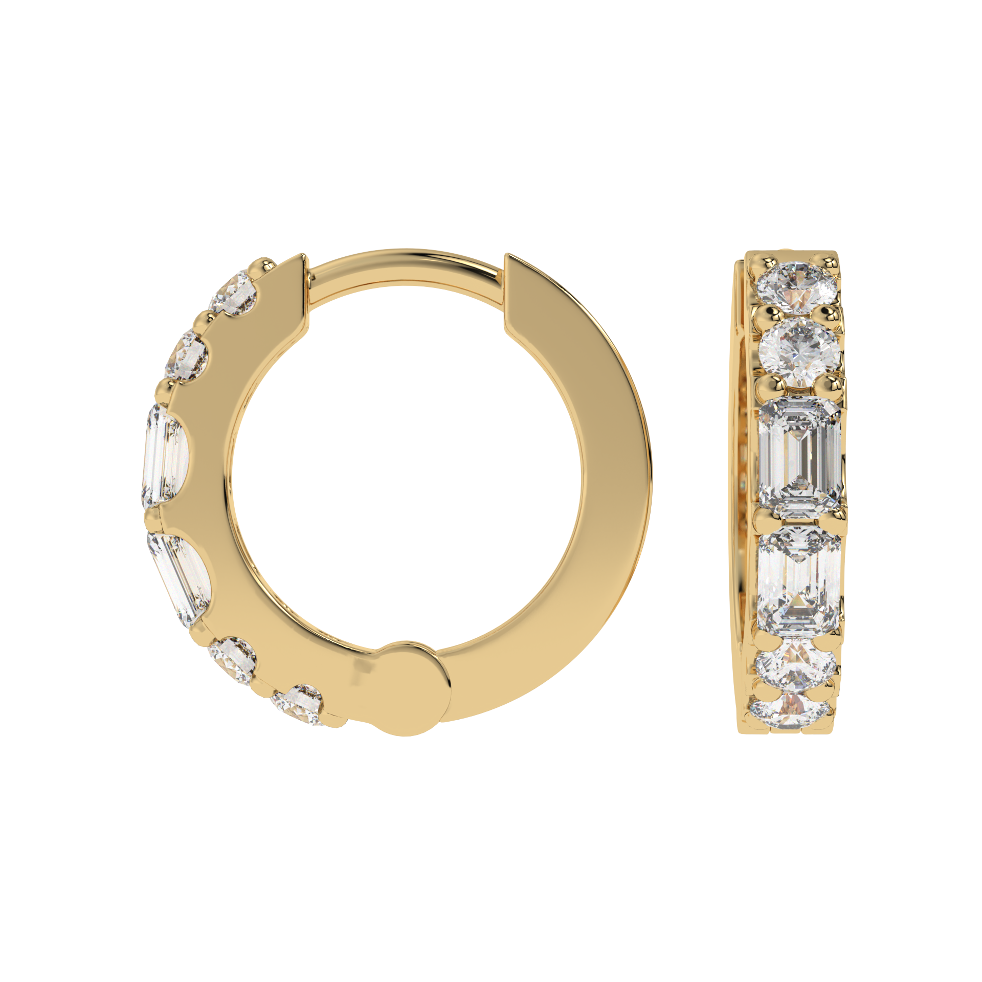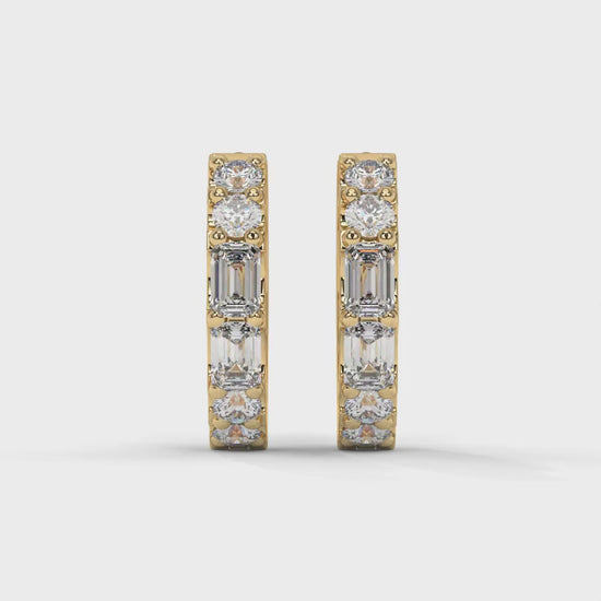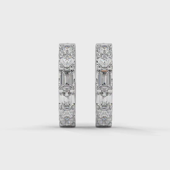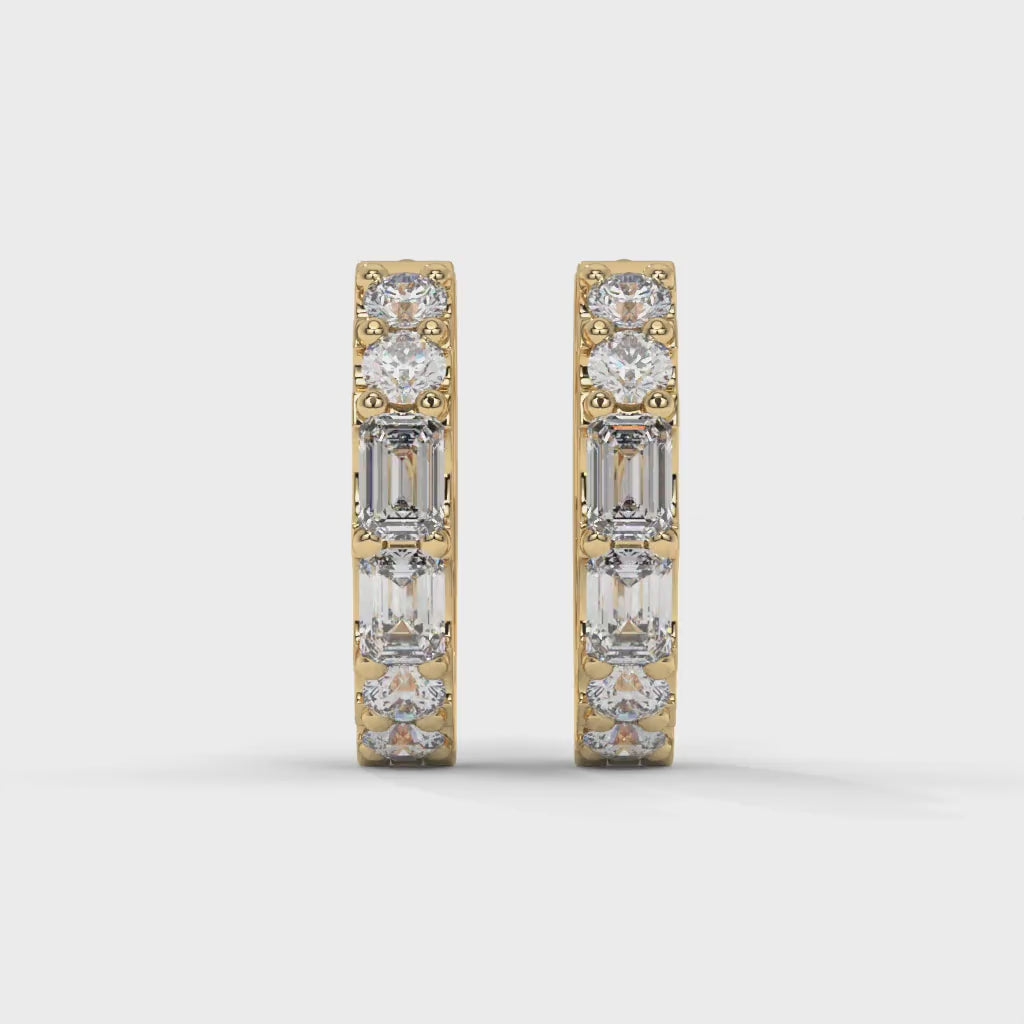 Modern hoop earrings showcasing alternating emerald-cut and round diamonds, blending classic brilliance with bold contemporary elegance.