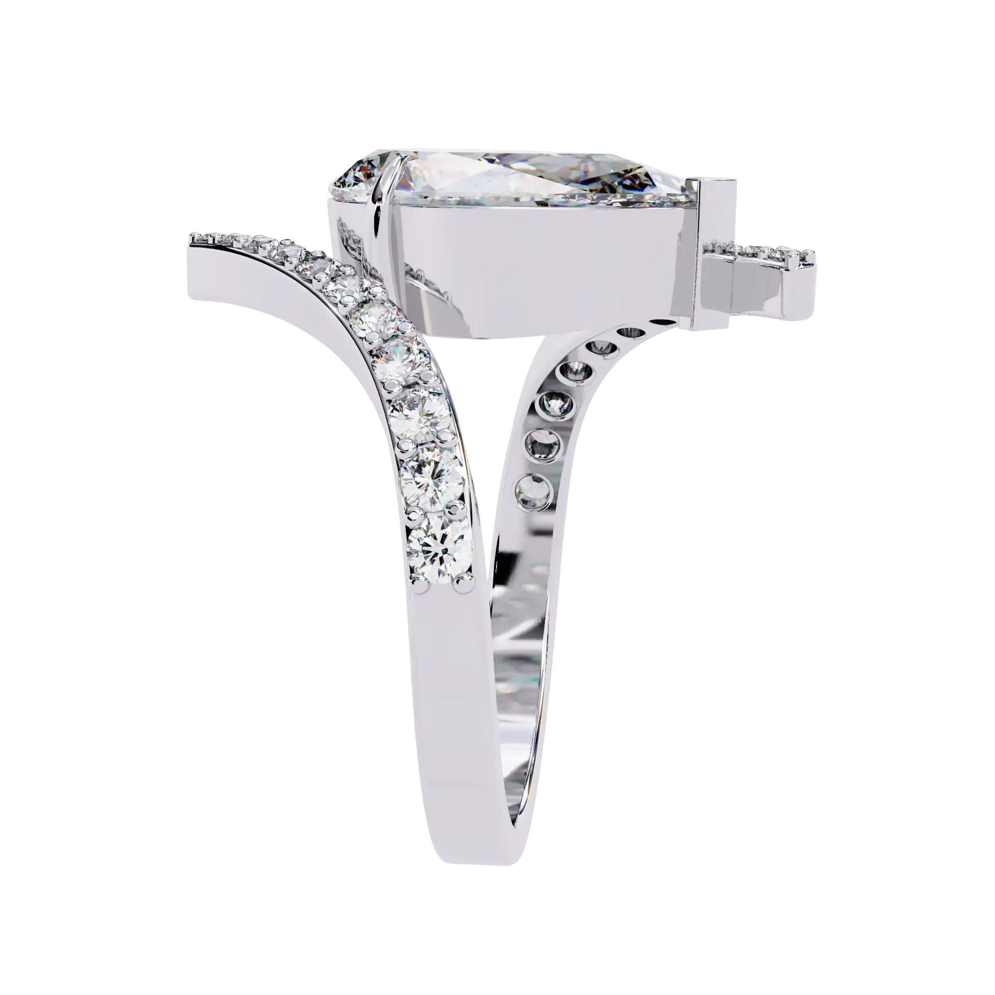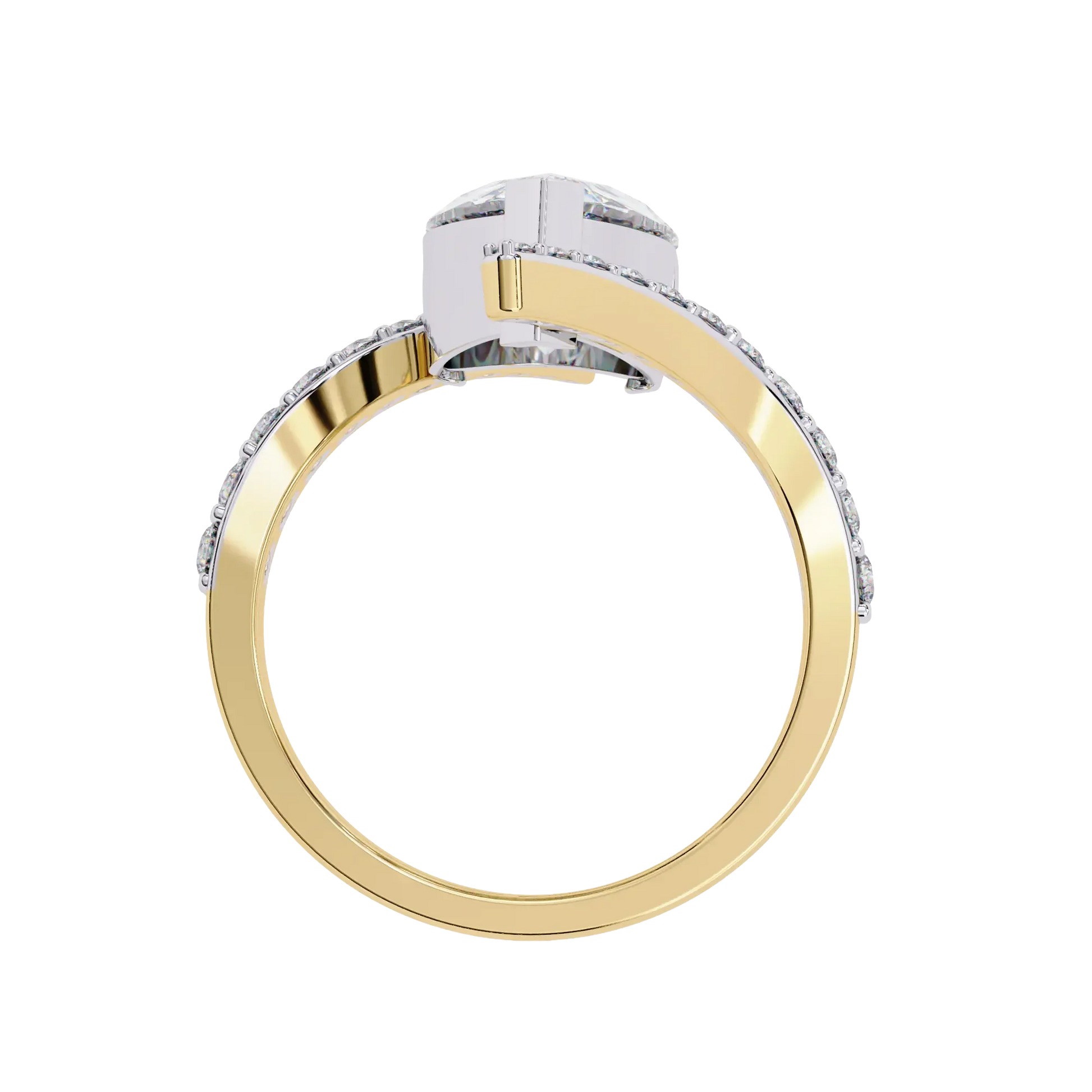 This stunning ring features a brilliant pear-shaped diamond, elegantly cradled in a modern bypass band. Crafted in dual-tone gold with pavé-set accent diamonds, the design offers a bold yet graceful statement. Perfect for those who seek timeless elegance with a contemporary twist. A true showstopper for special moments.