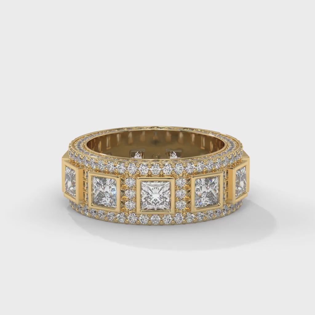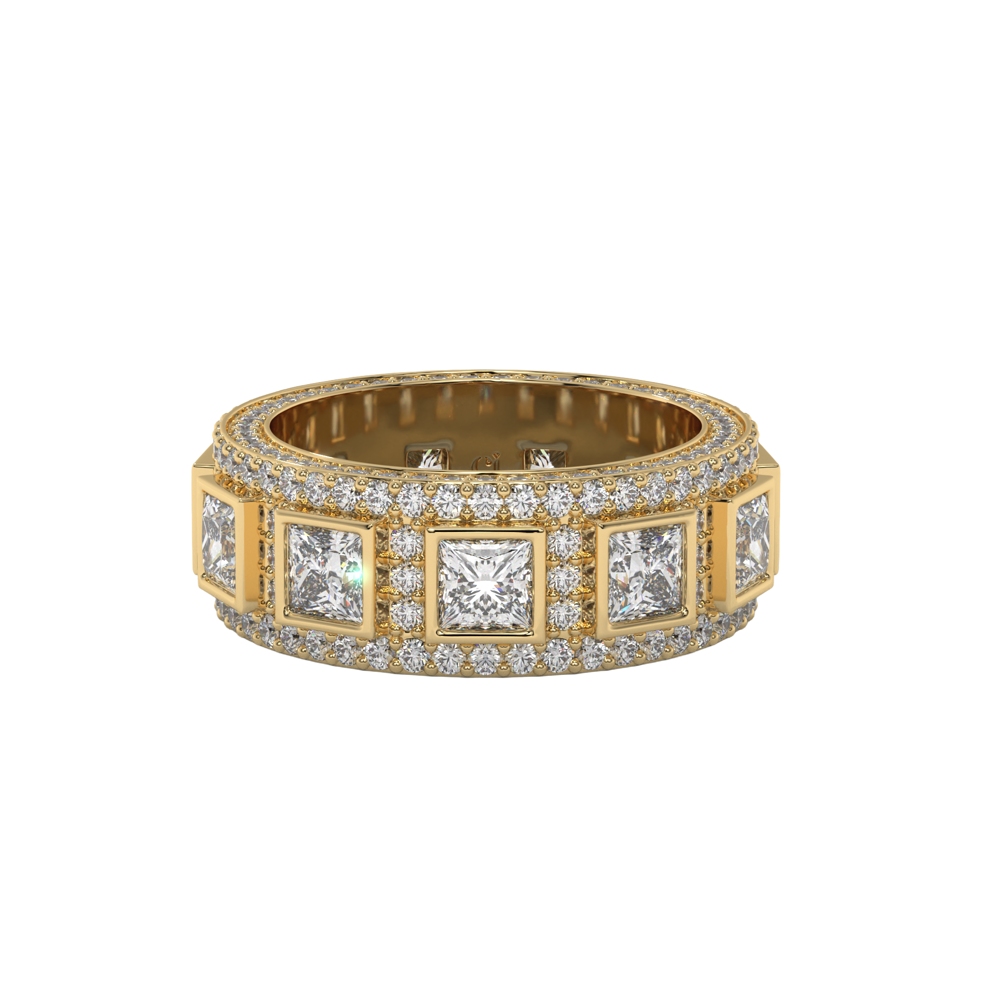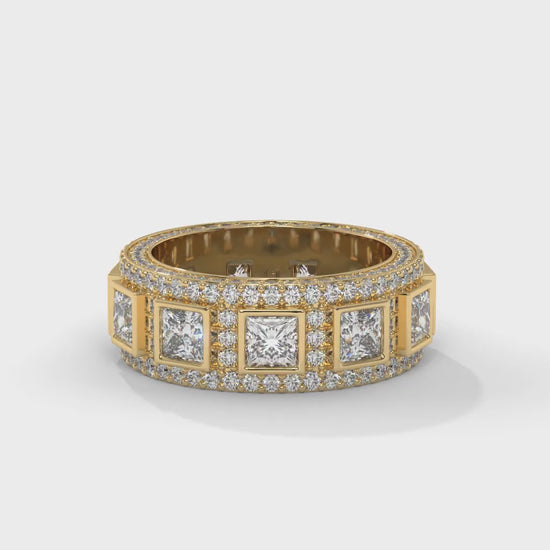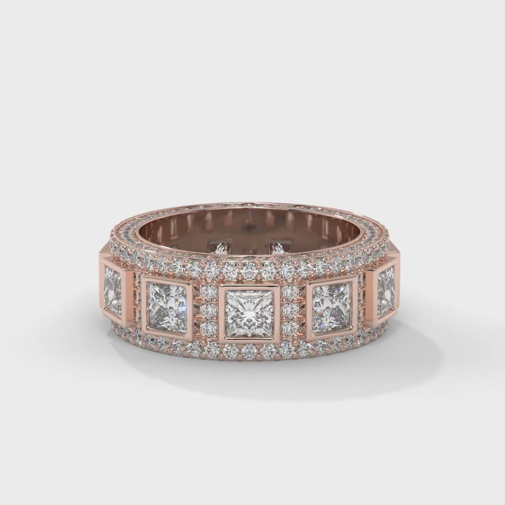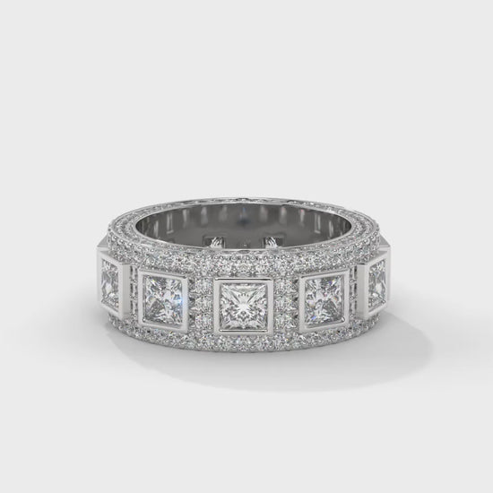 A striking band featuring princess-cut diamonds framed by shimmering pavé, exuding grandeur, luxury, and timeless sophistication.
